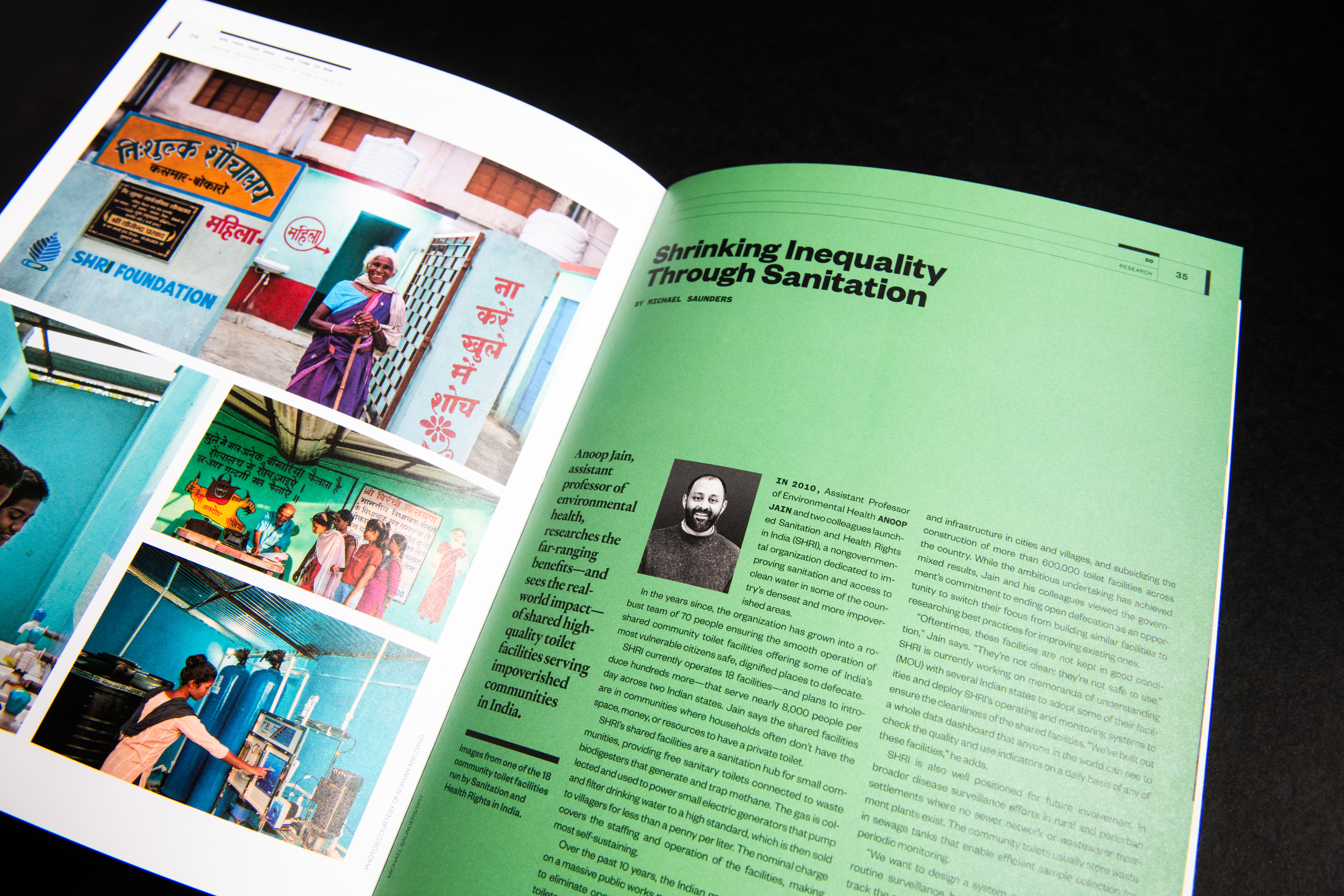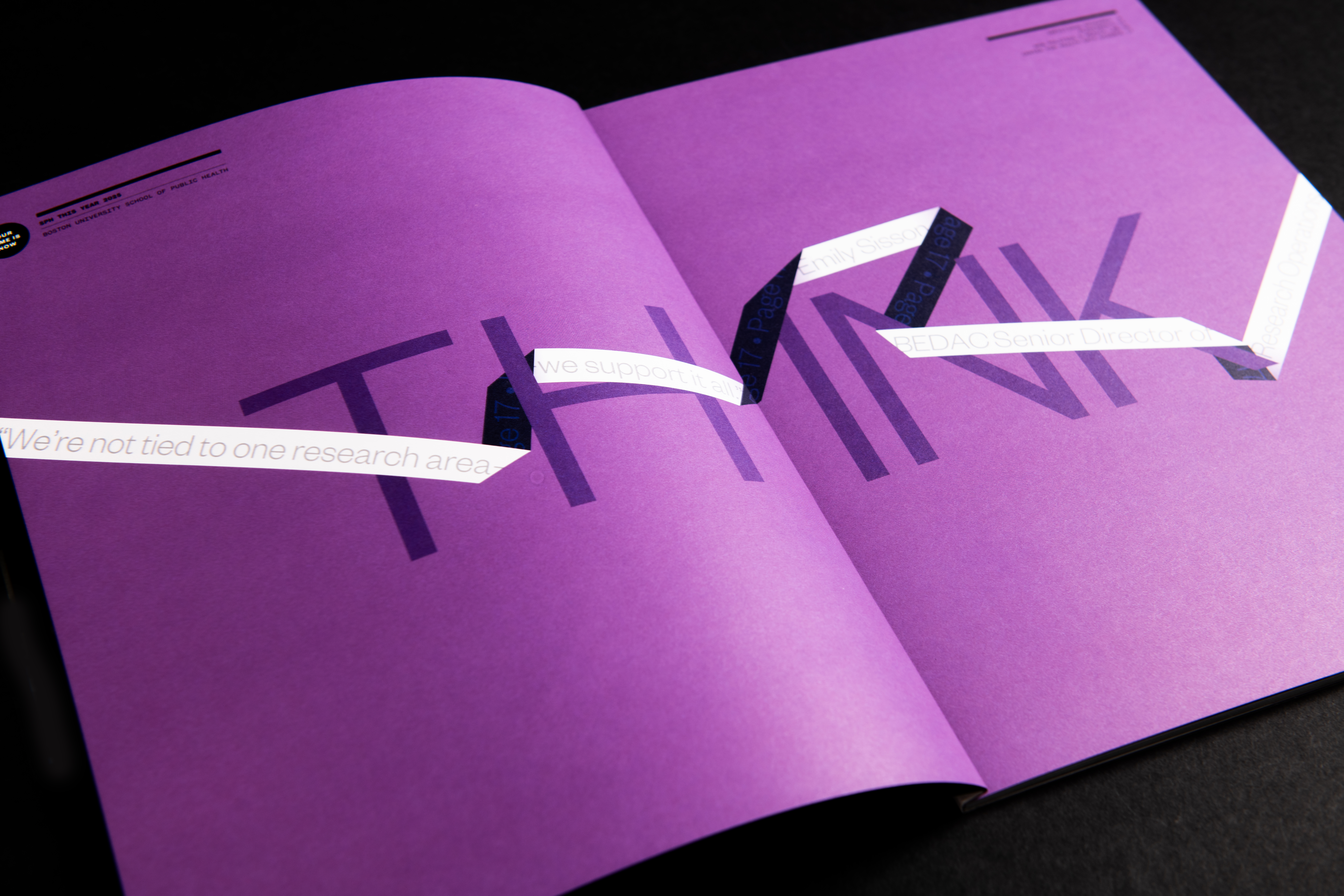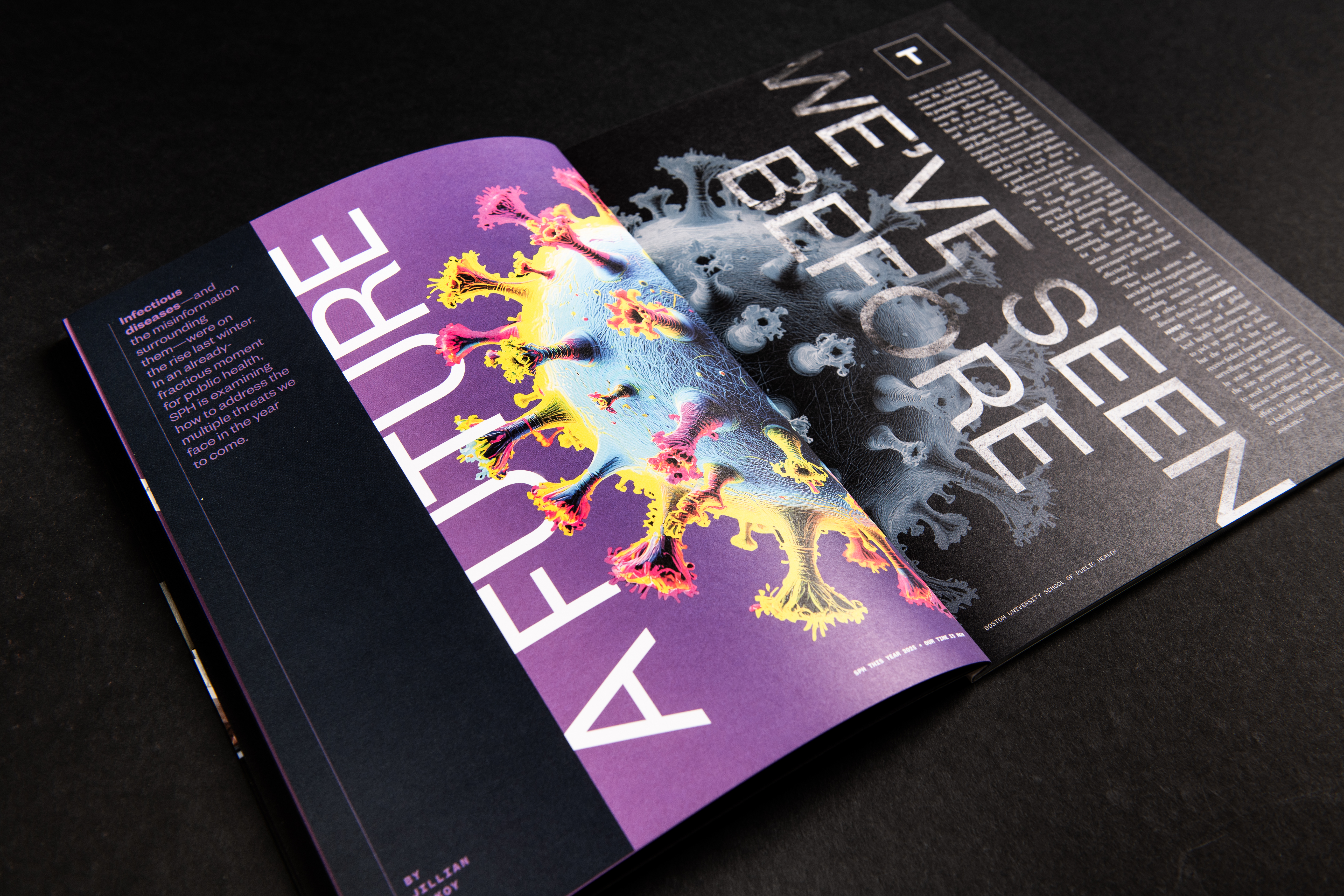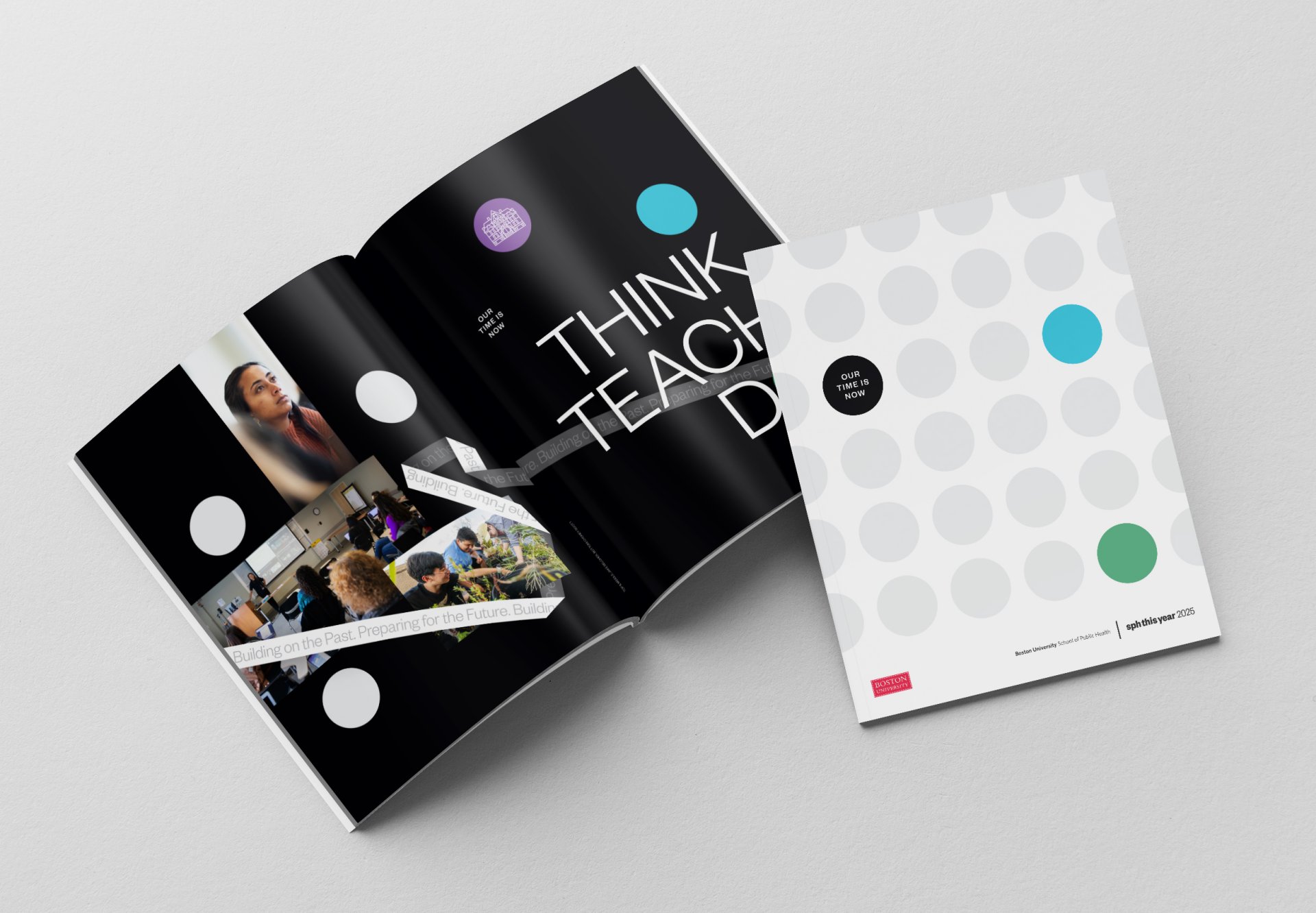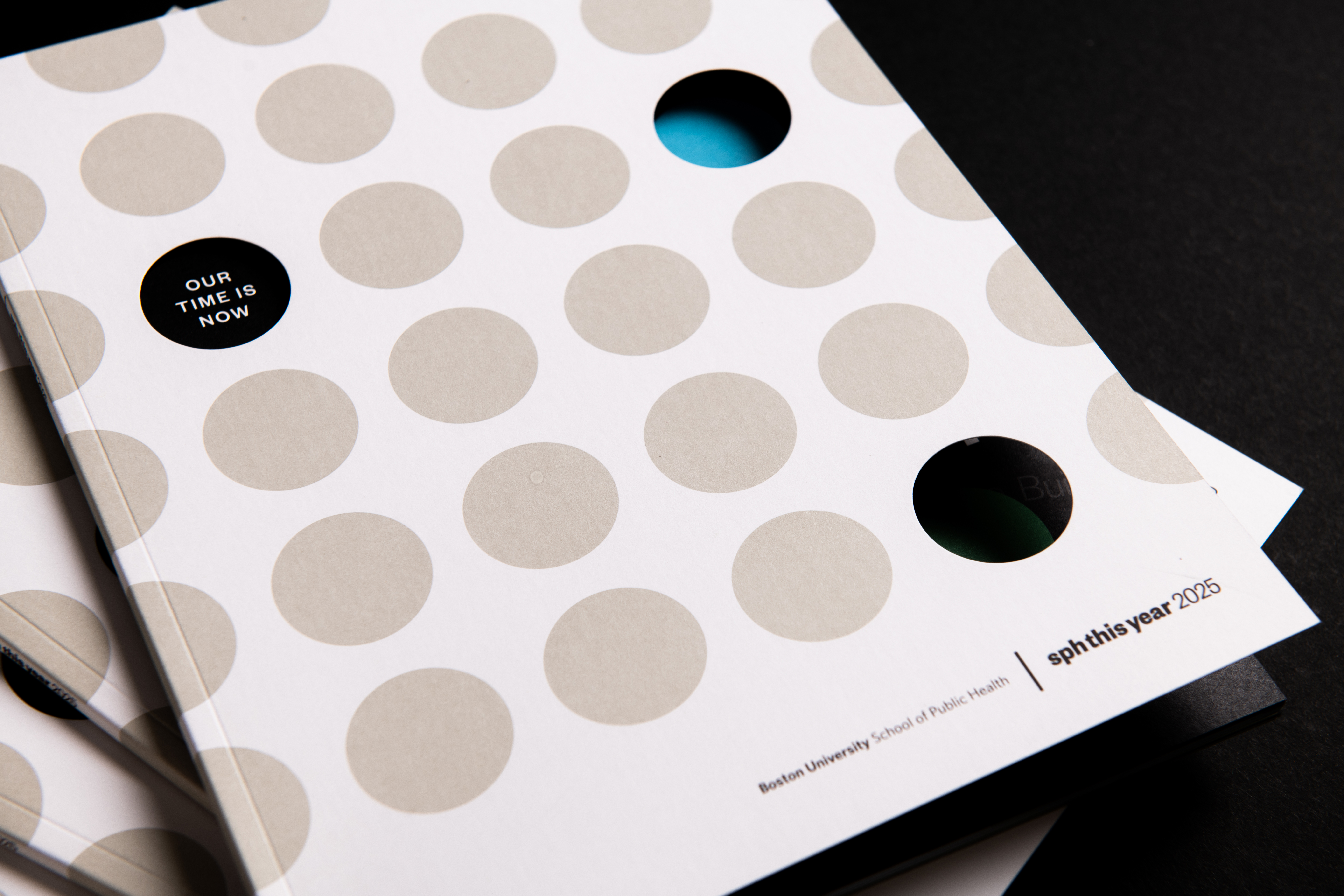 The theme of 2025 edition of SPH This Year is, “Our Time,” which focuses on the urgency and relevance of public health by bridging current and historical context, trust in science, and the political moment. The cover uses a die cut to bring the reader from light to dark to reinforce the challenging moment that public health is currently facing.