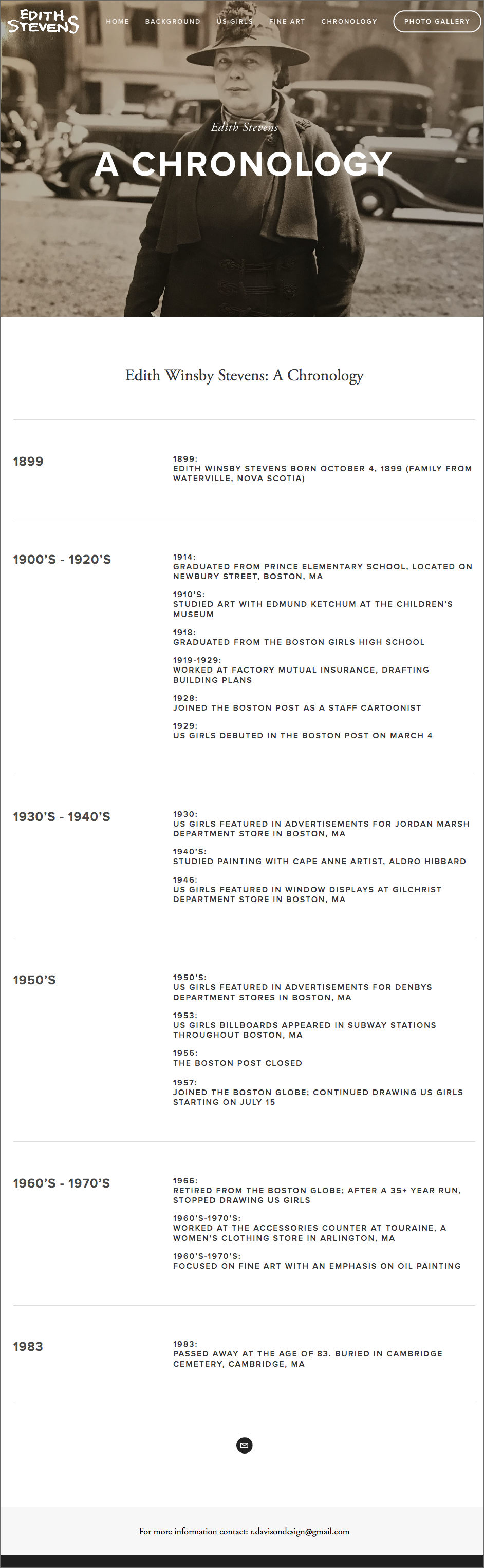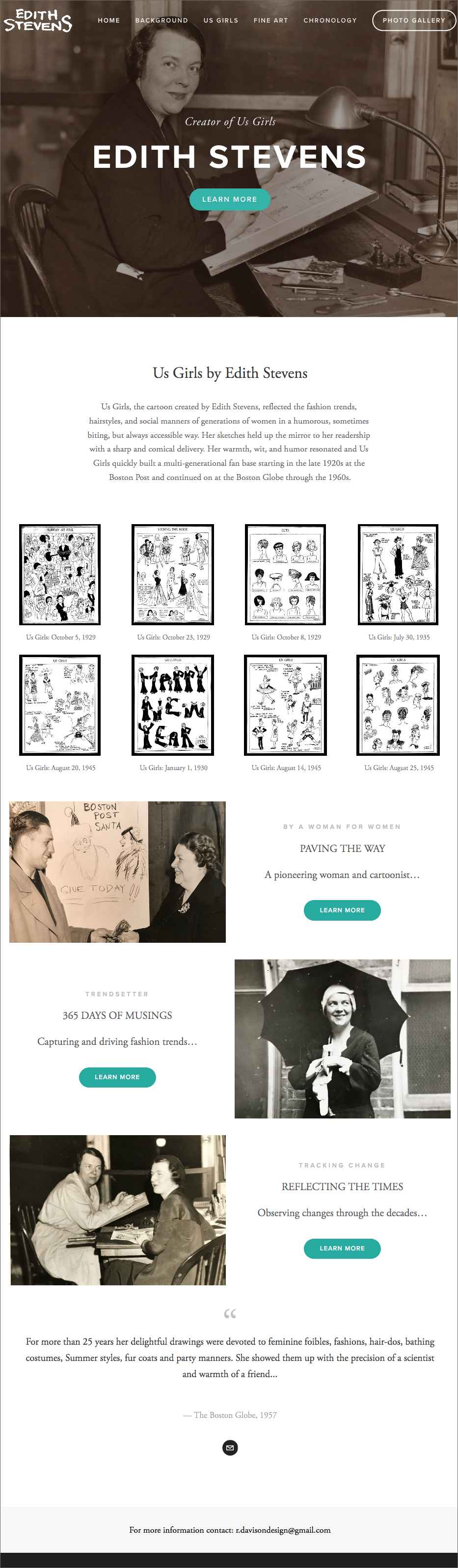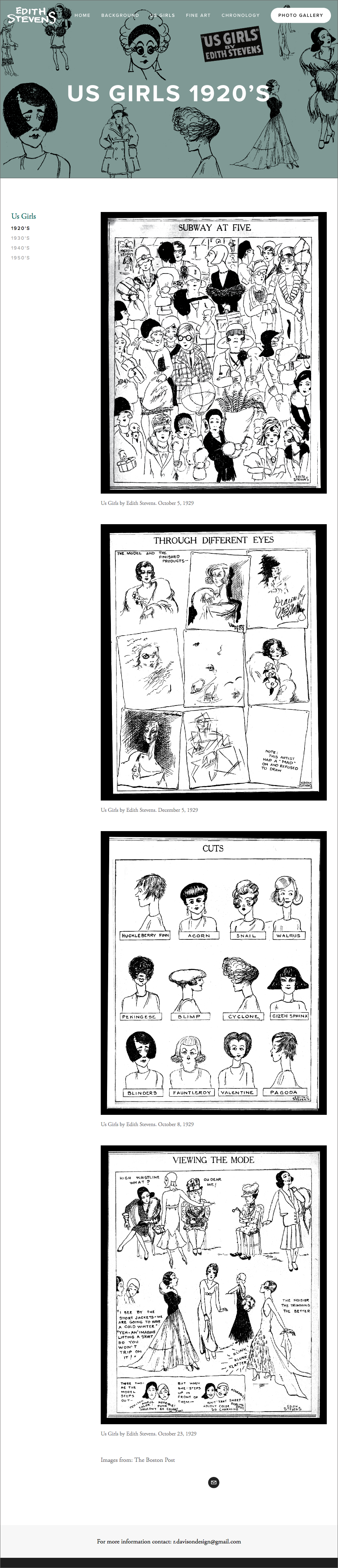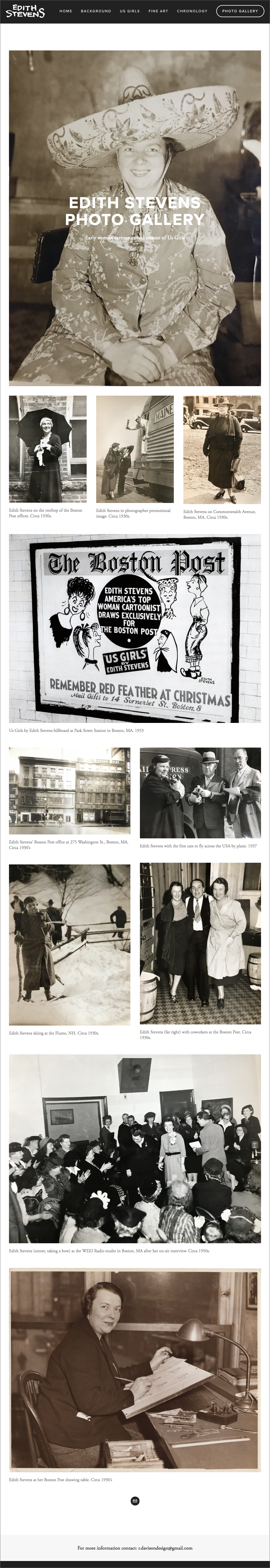 This website focuses on the life and work of Edith Winsby Stevens, creator of the single panel comic, Us Girls, which debuted in The Boston Post in 1929 and ran appeared 6 days a week, for over 3 decades. Edith was one of the first woman cartoonists to work at a major daily newspaper, and whose strip targeted a female audience. The site provides an overview of her influence as a cartoonist and artist as well as chronicles the progression of Us Girls through the decades.
