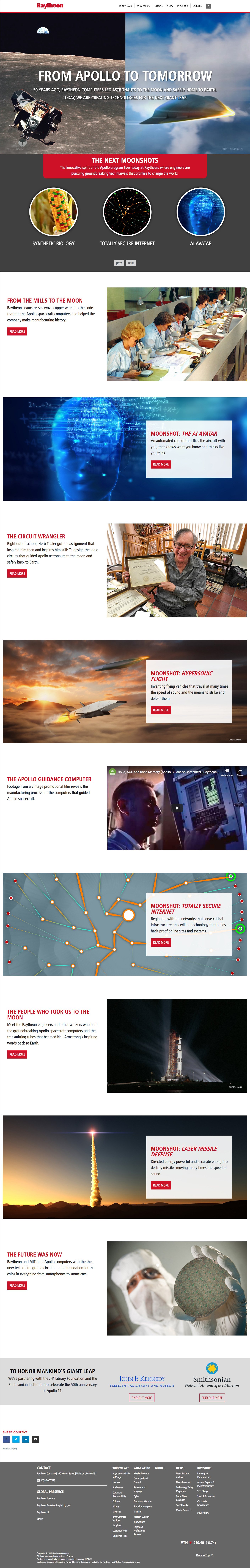 This website served as the main hub for Raytheon’s moonshot campaign, which marked the 50th anniversary of the Apollo 11 moon landing. Raytheon’s leading edge technologies and commitment to developing the next moonshot are featured throughout the site.