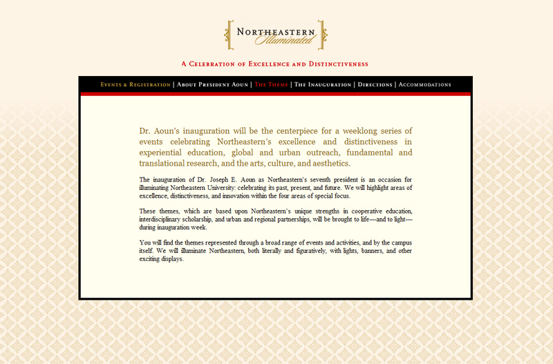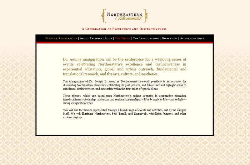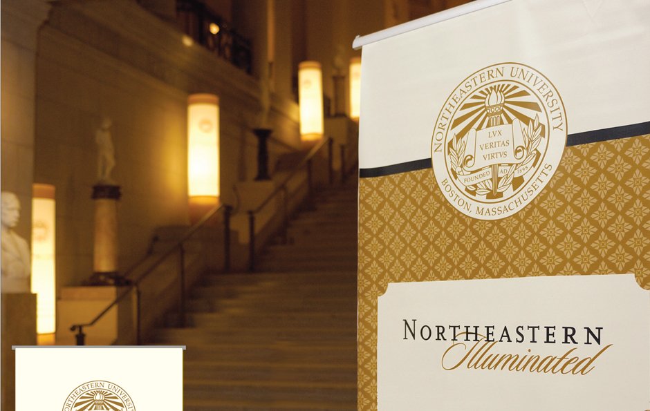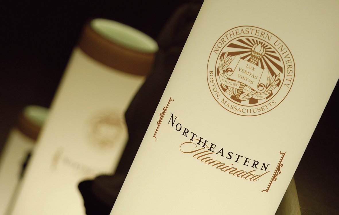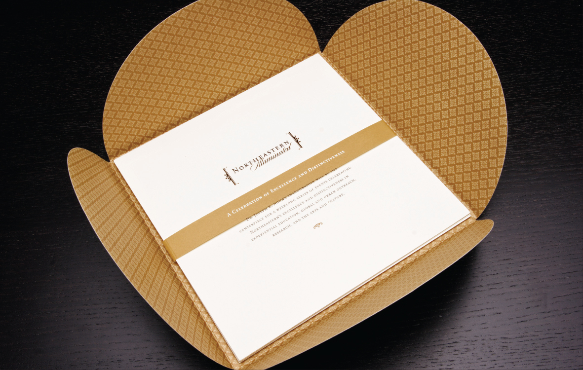 To brand the series of events surrounding the inauguration of the University’s new president, the theme “Northeastern Illuminated” was developed. Calligraphic script, classical typography and lush patterns were utilized to establish an elegant and formal tone to the package of communication materials.